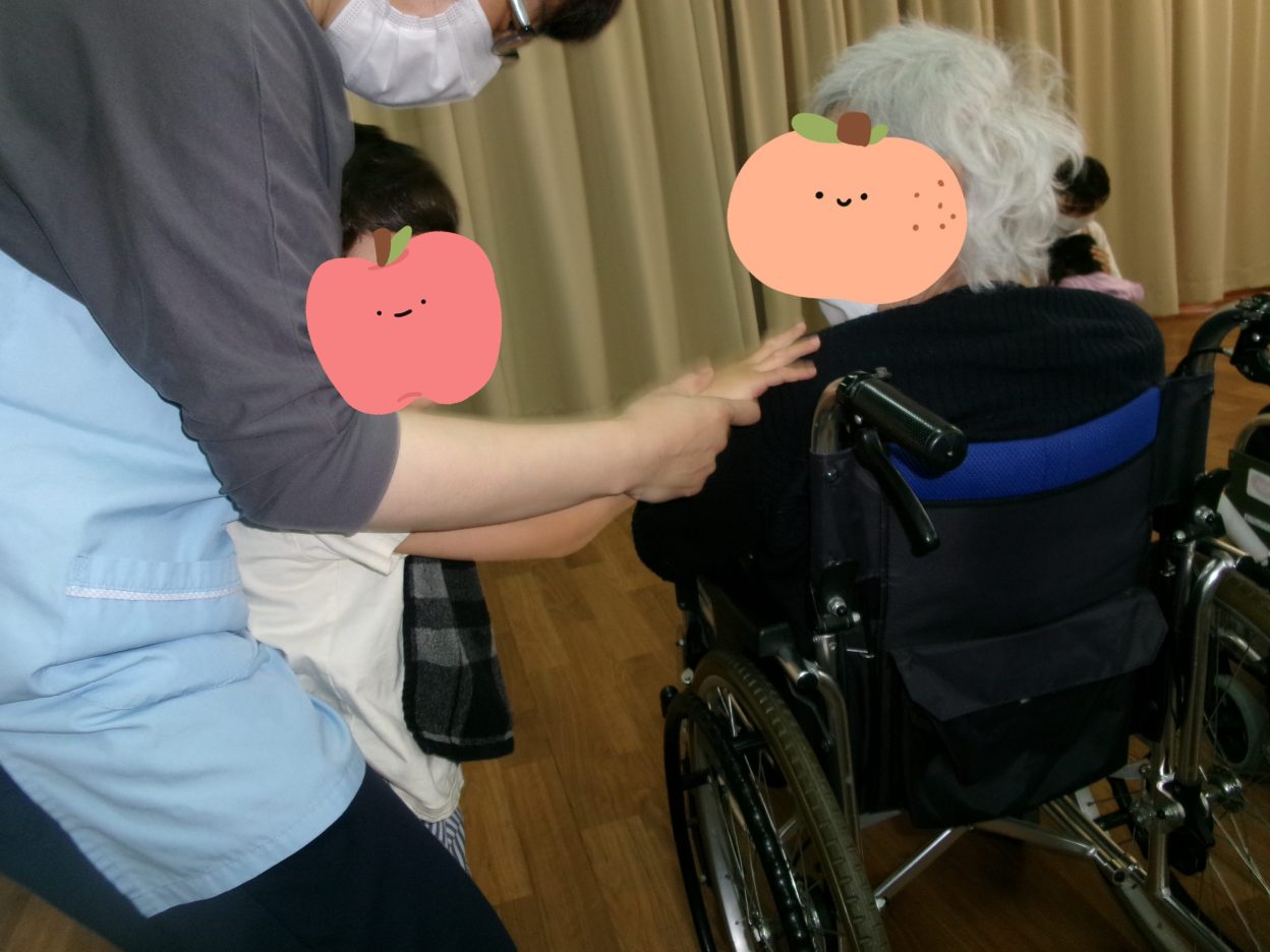 「かたたたき」の手遊び歌では、利用者さんの肩をトントンと叩かせていただきました!