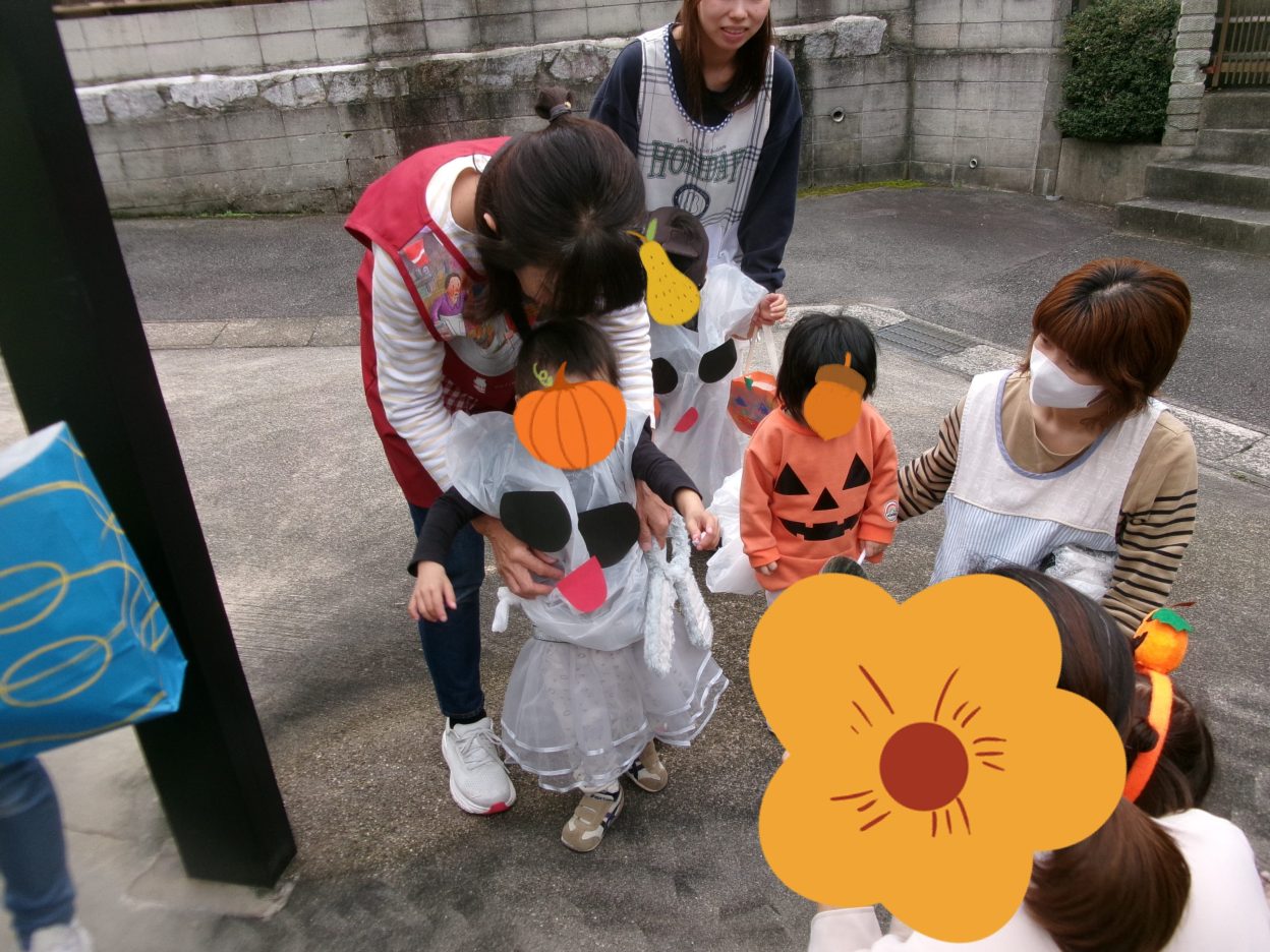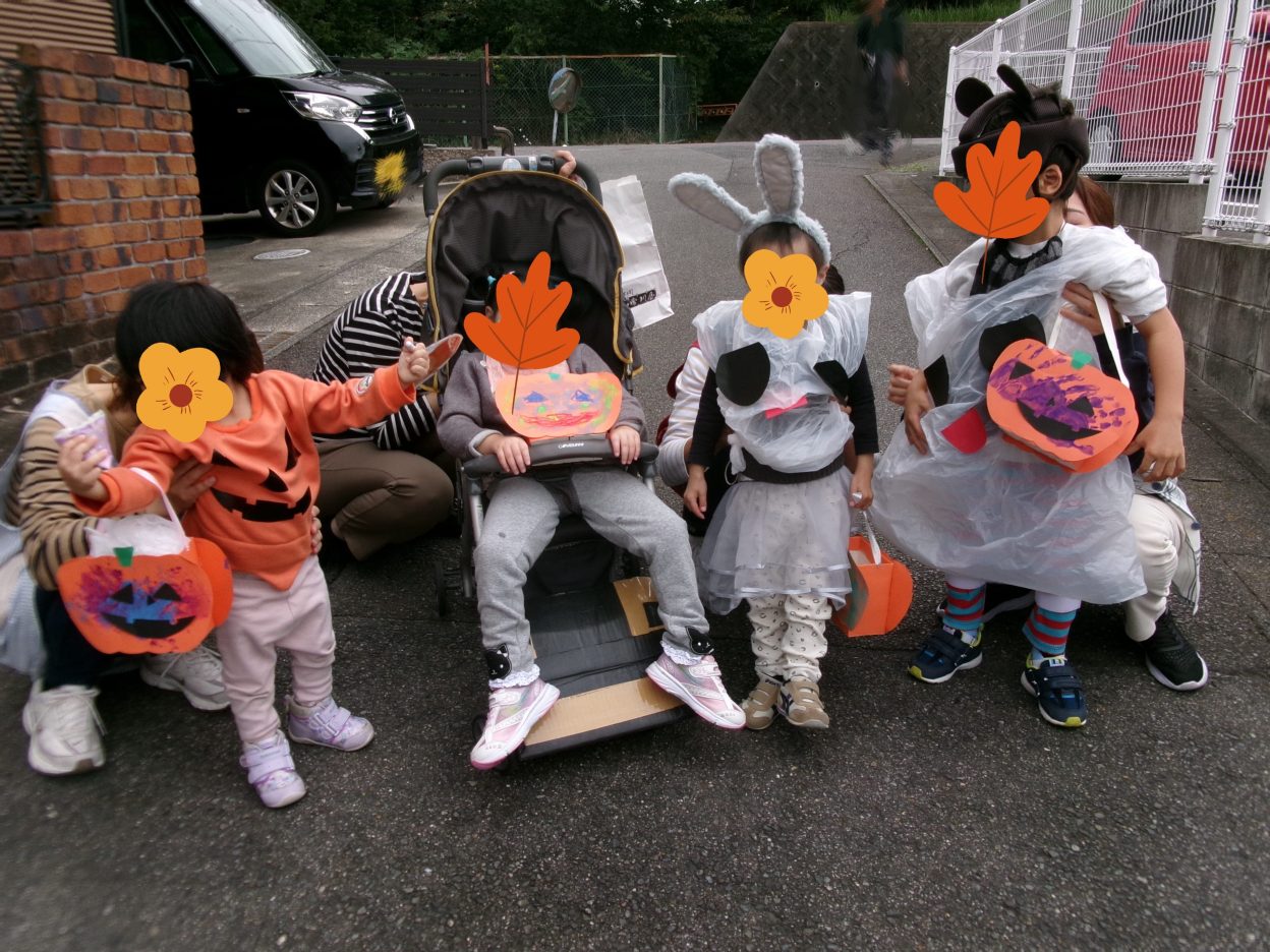 おばけに変身したら、ご近所さんにお菓子配りをしに出発🍭