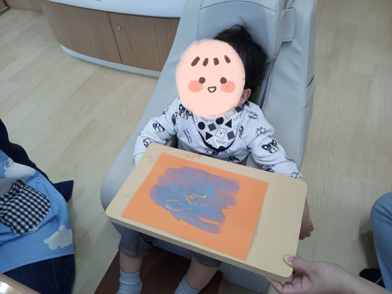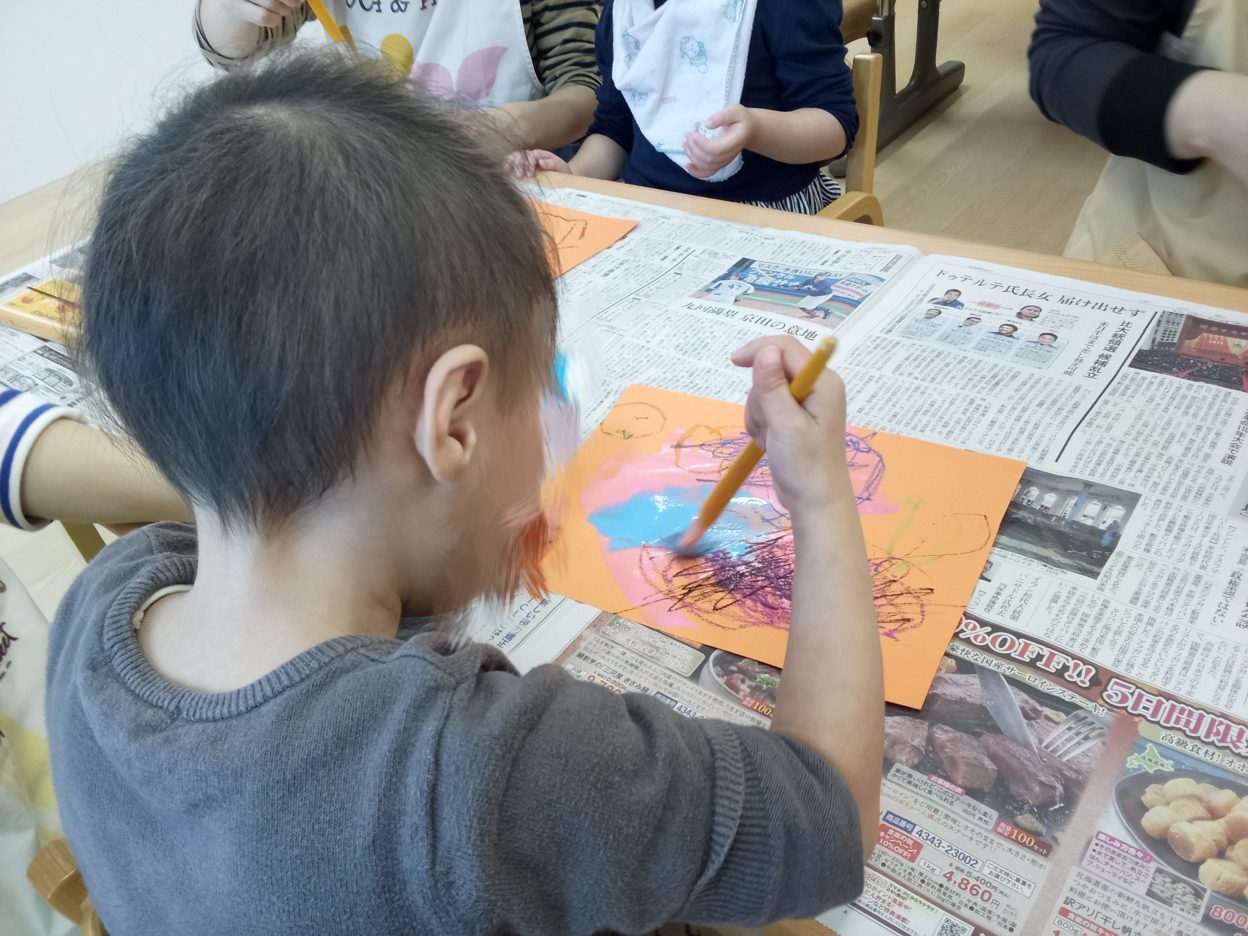 その上から絵の具を塗る、はじき絵にも挑戦!とっても鮮やかなかぼちゃができあがりました✨