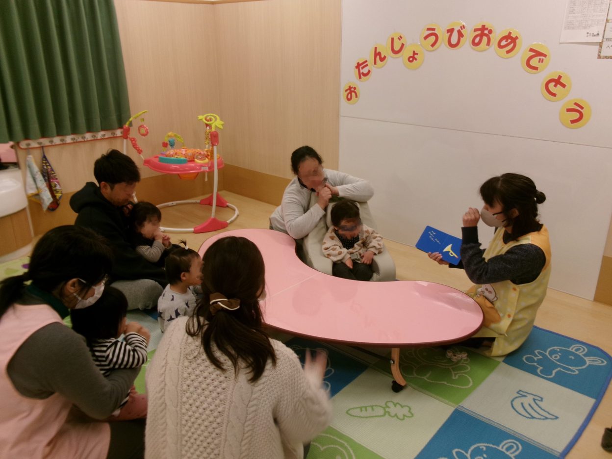 お気に入りの「びりびりじゃあじゃあ」の絵本を読んだり、お誕生日の歌を歌ったりしてお祝いしました☺