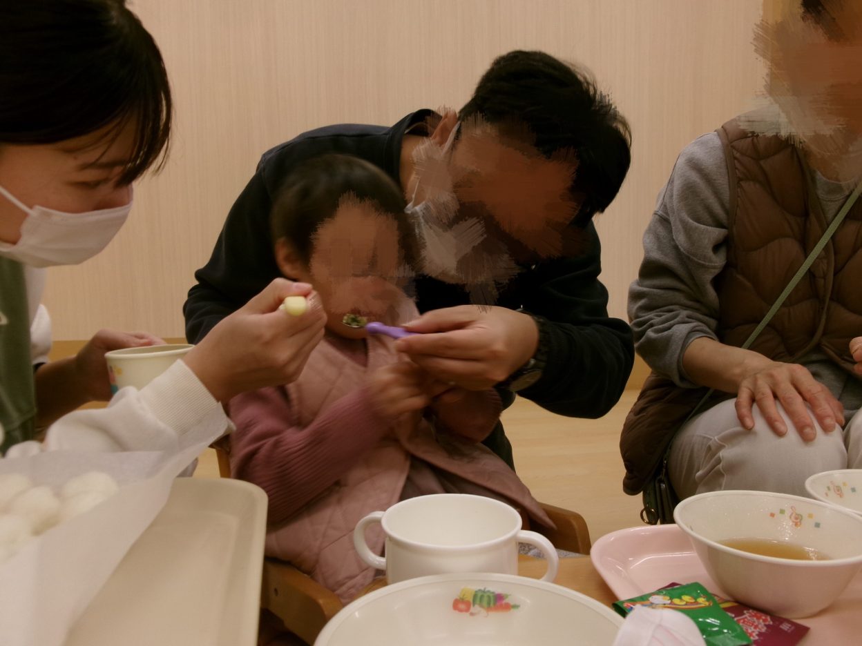 ラップの芯でおもちを伸ばしたり叩いたりしたものを、保護者の方々と一緒にこねこねと丸めました◎
