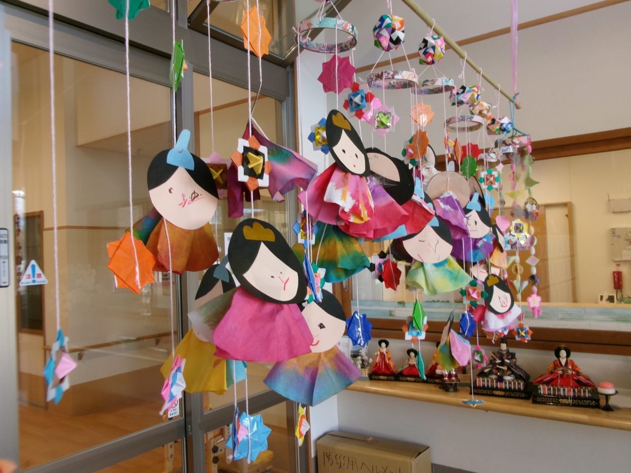 完成した作品は、法人職員さんからいただいた可愛い折り紙を使って、吊るし雛にしました✨