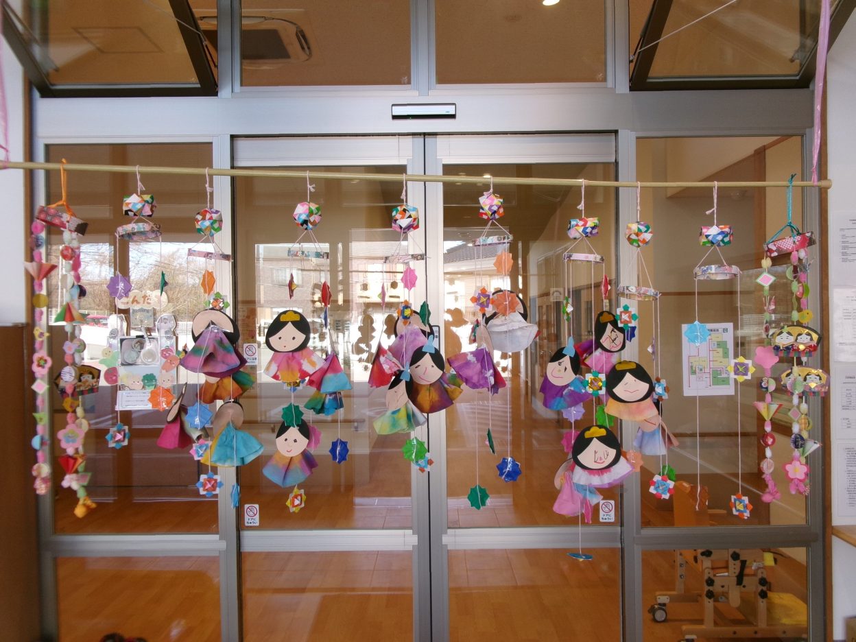 完成した作品は、法人職員さんからいただいた可愛い折り紙を使って、吊るし雛にしました✨