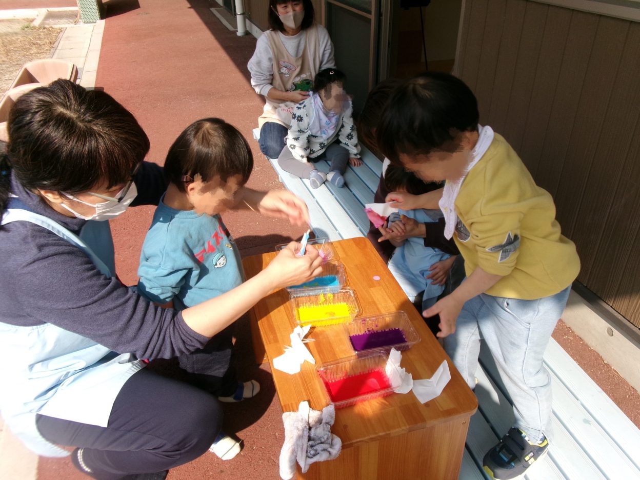 服はコーヒーフィルターを、色水で染め紙をしたり、フィルターを濡らして指や筆を使ったりして、にじみ絵に挑戦!
