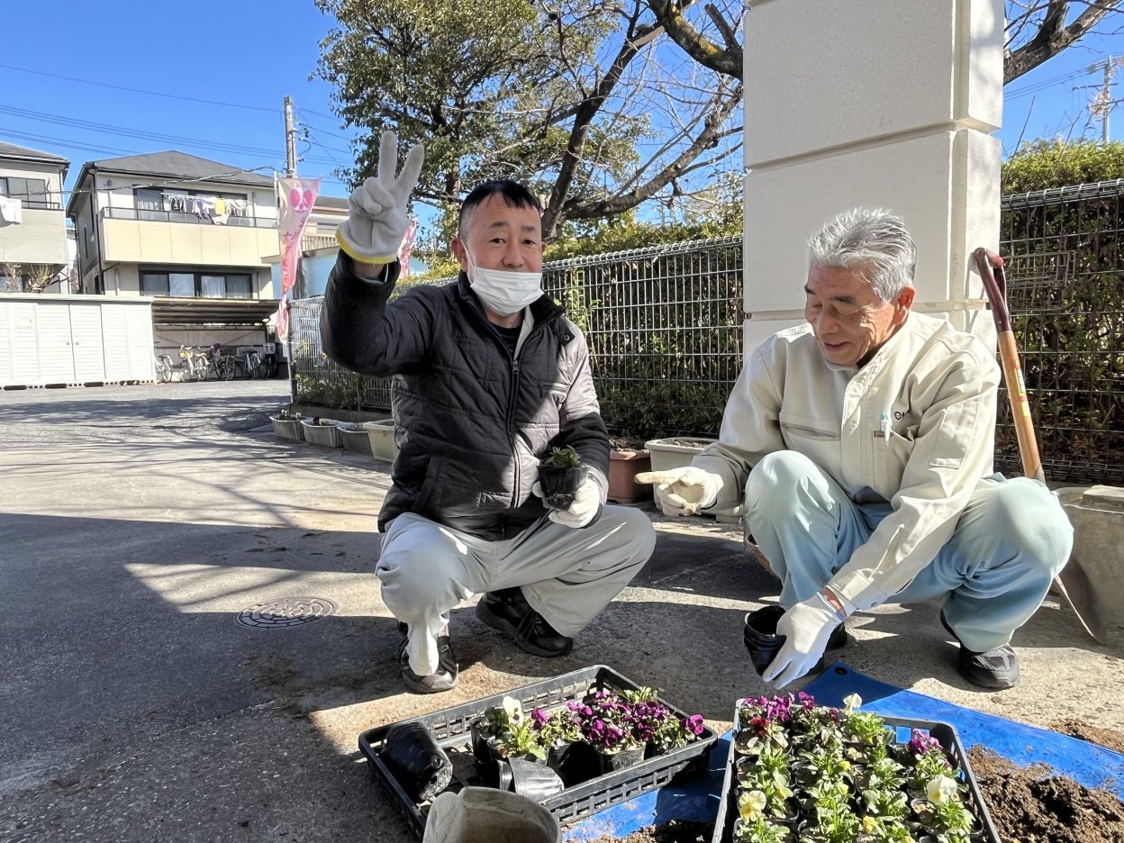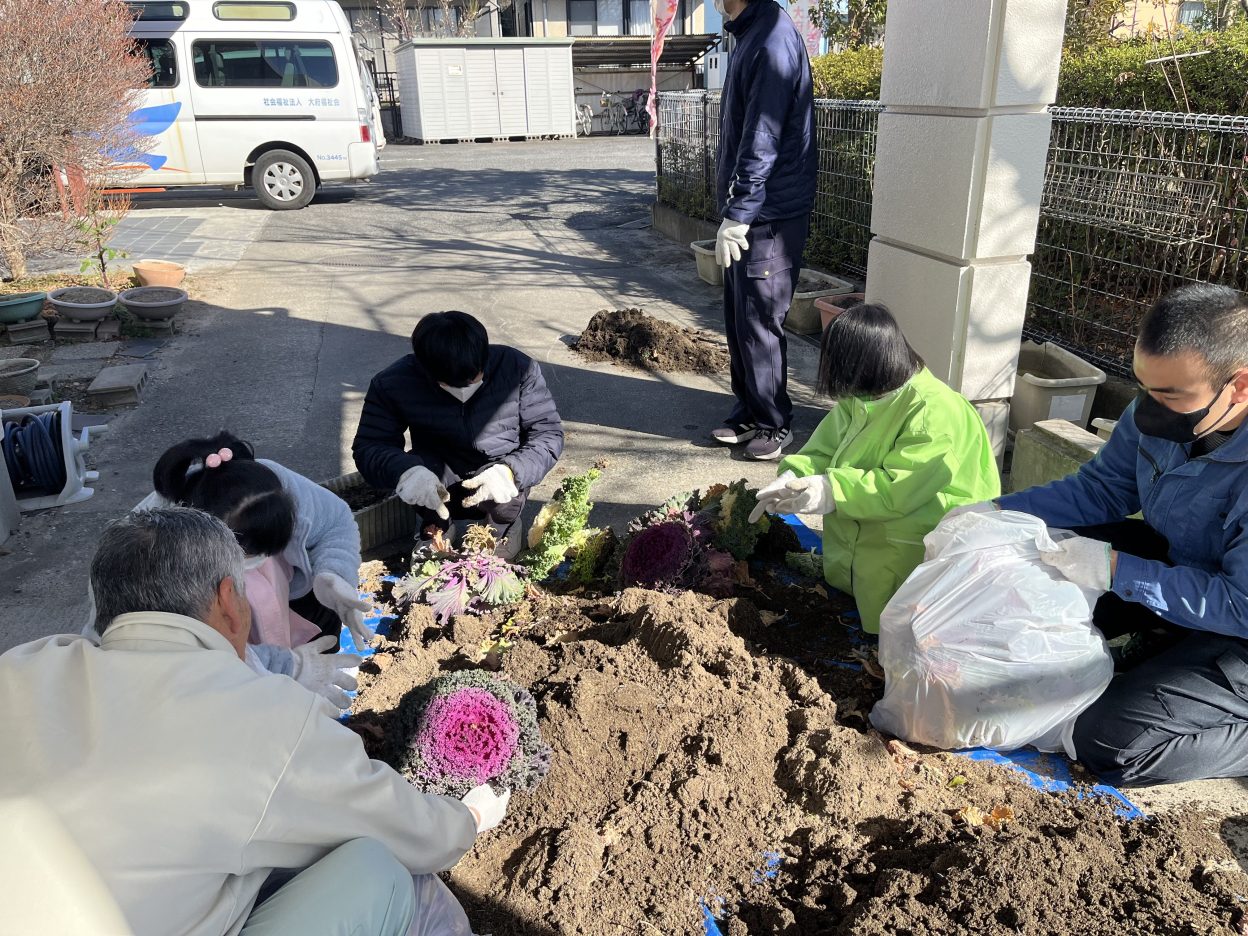 先日、あけび苑では玄関の花の植え替えを行いました。