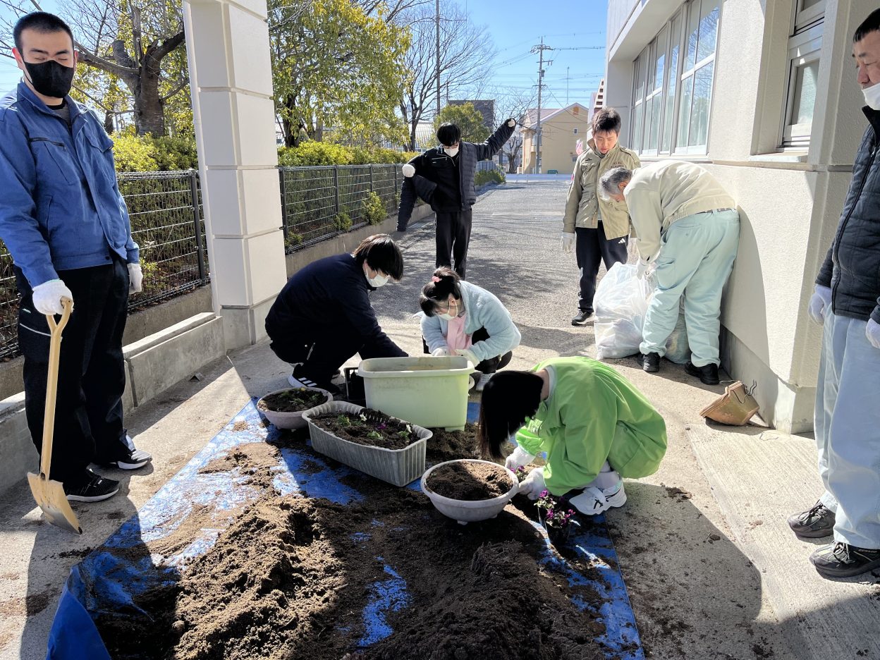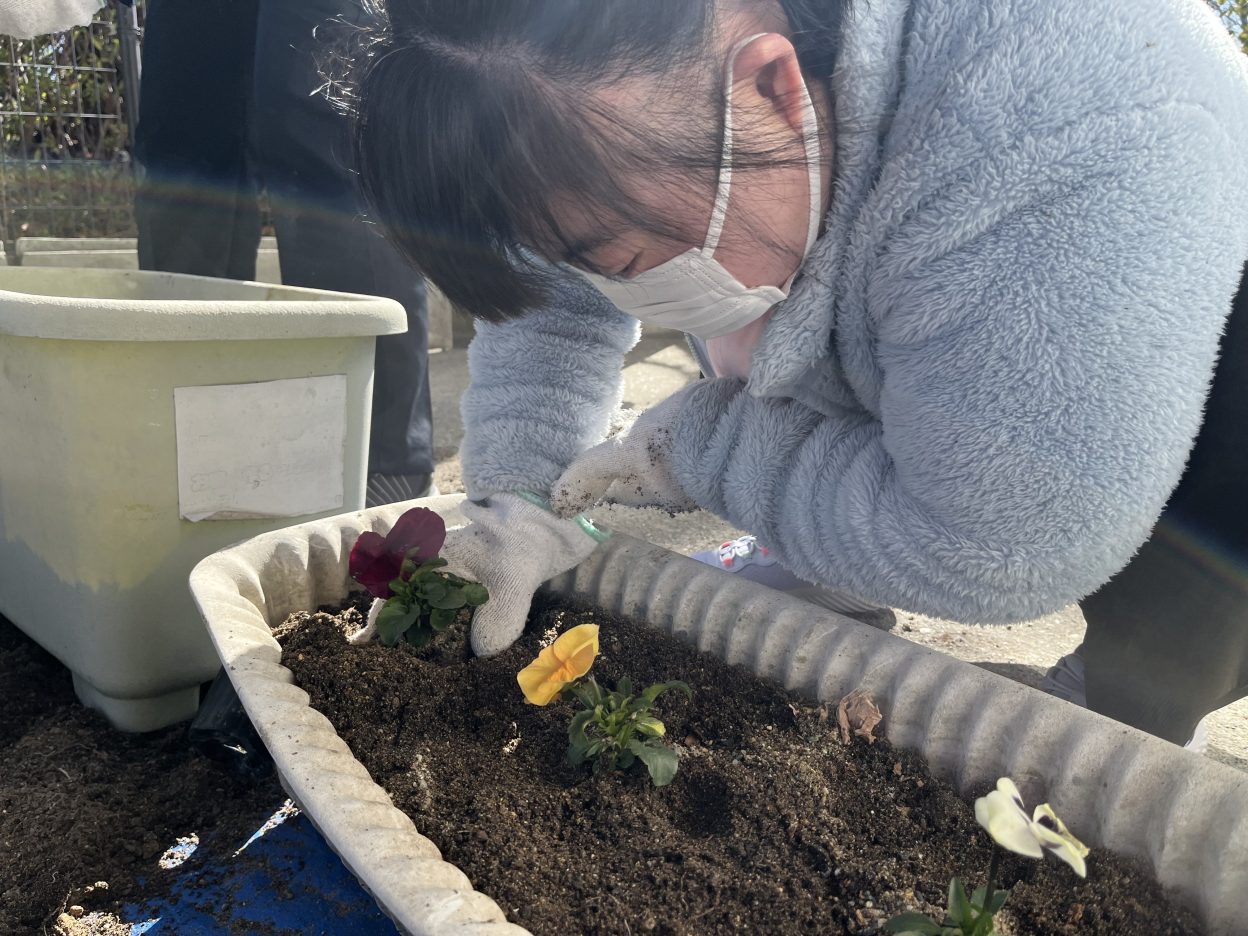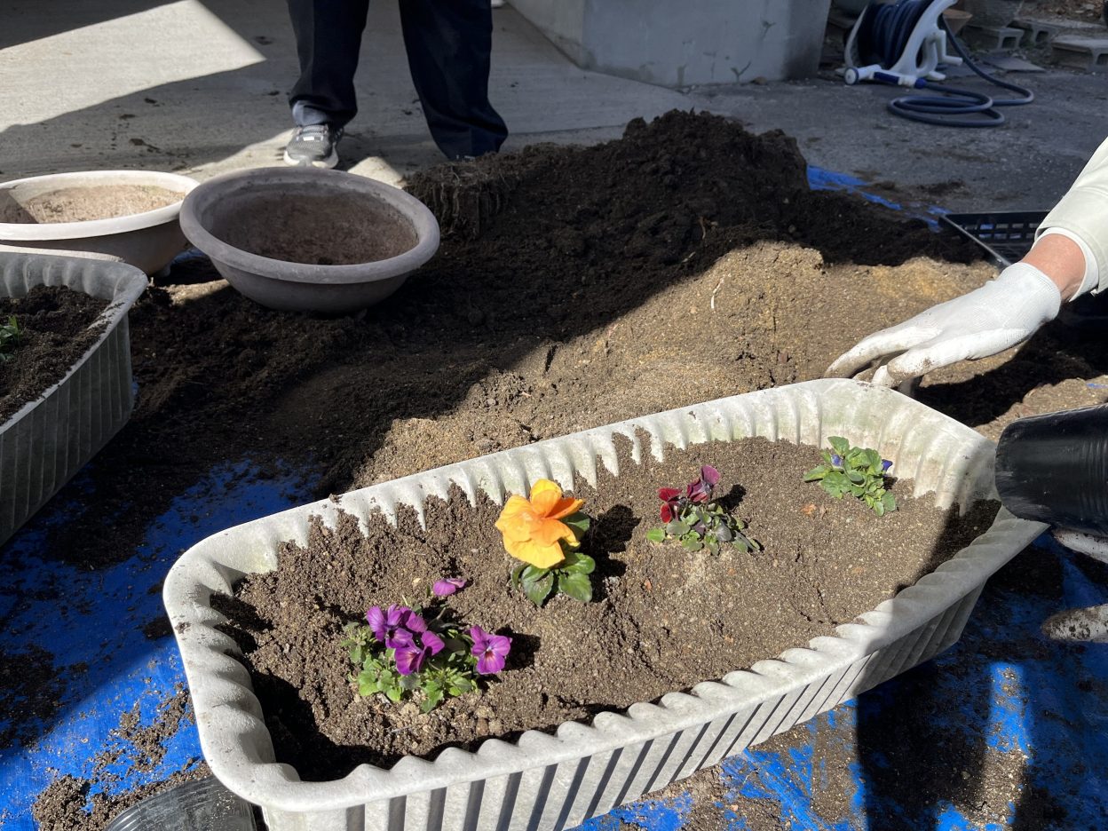花を植える作業に移ると、そ~っとビニールポットから苗を取り出して、慎重に慎重に鉢に植えていました。