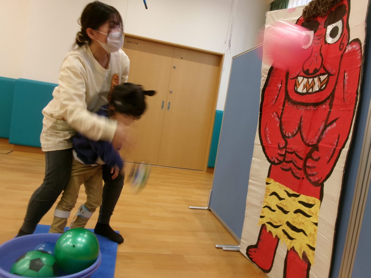 「鬼は外、福は内!」と言いながらボールを投げるみのりっこ!