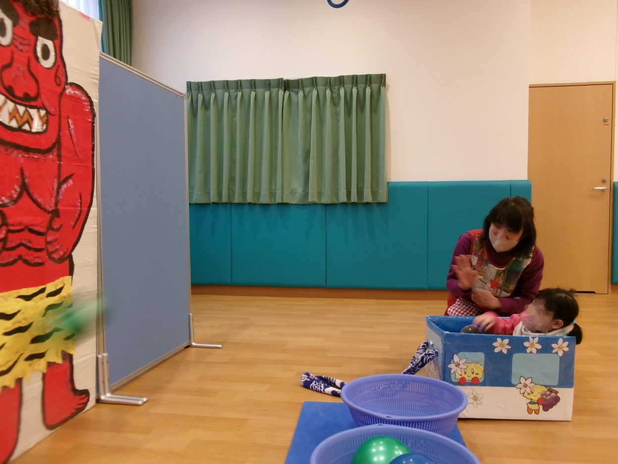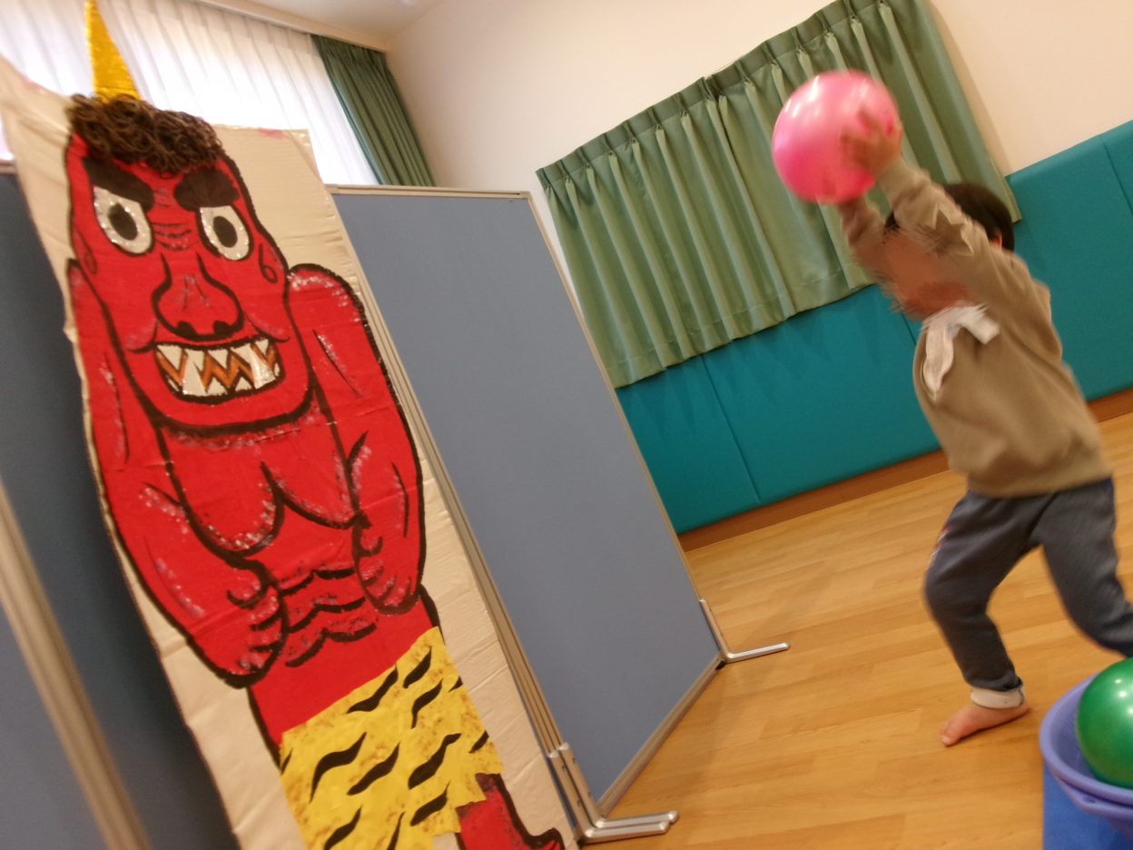 「鬼は外、福は内!」と言いながらボールを投げるみのりっこ!
